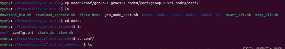 5.节点3拷贝节点1的node/conf/group.1.genesis(内含群组节点初始列表)和node/conf/group.1.ini 到 node4/conf目录下,不需改动;